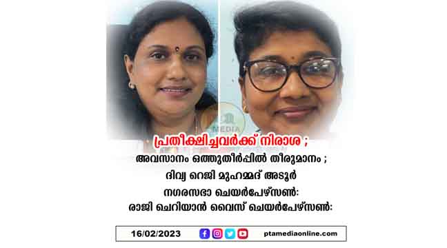 തിങ്കളാഴ്ച രാവിലെ11 ന് അടൂർ ആർഡിഓയും വരണാധികാരിയുമായ എ.തുളസീധരൻ പിള്ളയുടെ അധ്യക്ഷതയിലാണ് തെരഞ്ഞെടുപ്പ് നടന്നത്. ദിവ്യാ റെജി മുഹമ്മദിന് 16 വോട്ടുകൾ ലഭിച്ചു. ദിവ്യയ്ക്ക് എതിരായി മത്സരിച്ച യു.ഡി.എഫ് സ്ഥാനാർത്ഥി വി.ശശികുമാറിന് 11 വോട്ടുകളാണ് ലഭിച്ചത്. ദിവ്യയുടെ പേര് മുൻ നഗരസഭ ചെയർമാൻ ഡി.സജി നിർദേശിച്ചു. കൗൺസിലർ എം.അലാവുദ്ദീൻ പിൻതാങ്ങി. ഉച്ചയ്ക്കു ശേഷം നടന്ന വൈസ് ചെയർപേഴ്സൺ തെരഞ്ഞെടുപ്പിൽ രാജി ചെറിയാന് 16 വോട്ടുകൾ ലഭിച്ചു. എതിരായി മത്സരിച്ച യു.ഡി.എഫിലെ ബിന്ദു കുമാരിക്ക് 11 വോട്ടും ലഭിച്ചു. ബി.ജെ.പി. കൗൺസിലർ ശ്രീജാ.ആർ. നായർ ബാലറ്റ് കൈപ്പറ്റാതെ രണ്ടു തെരഞ്ഞെടുപ്പിൽ നിന്നും വിട്ടു നിന്നു.