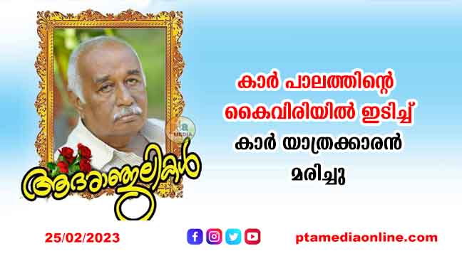 എടത്വ: നീയന്ത്രണം വിട്ട കാർ പാലത്തിന്റെ കൈവിരിയിൽ ഇടിച്ച് കാർ യാത്രക്കാരൻ മരിച്ചു. വീയപുരം രണ്ടാം വാർഡിൽ ഇലഞ്ഞിക്കൽ പുത്തൻപുരയിൽ ഇലഞ്ഞിക്കൽ ട്രാവൽസ് ഉടമ ഇട്ടി ചെറിയാ ഫിലിപ്പ് (ഫിലിപ്പോച്ചൻ-68) ആണ് മരിച്ചത്. ഇന്ന് വൈകിട്ട് 5 ന് അമ്പലപ്പുഴ-തിരുവല്ല സംസ്ഥാന പാതയിൽ എടത്വ ഡിപ്പോയ്ക്ക് സമീപം ലക്ഷ്മി പാലത്തിന്റെ കൈവിരിയിൽ ഇടിച്ചാണ് അപകടമുണ്ടായത്. ഇട്ടി ചെറിയാ ഫിലിപ്പ് സഞ്ചരിച്ചിരുന്ന കാർ നീയന്ത്രണം തെറ്റി പോസ്റ്റിൽ ഇടിച്ച ശേഷം പാലത്തിന്റെ കൈവിരിയിൽ ഇടിച്ച് നിൽക്കുകയായിരുന്നു. അപകടത്തെ തുടർന്ന് ആലപ്പുഴയിൽ നിന്നെത്തിയ ആംബുലൻസിൽ തിരുവല്ലായിലെ സ്വകാര്യ ആശുപത്രിയിൽ എത്തിച്ചെങ്കിലും ജീവൻ രക്ഷിക്കാനായില്ല. സംസ്കാരം പിന്നീട്. ഭാര്യ: സൂസൻ ഫിലിപ്പ്. മക്കൾ: അരുൺ ഫിലിപ്പ്, കിരൺ ഫിലിപ്പ്, തരുൺ ഫിലിപ്പ്. മരുമക്കൾ: ലിജോ, ഫെബി, ജെന്നി