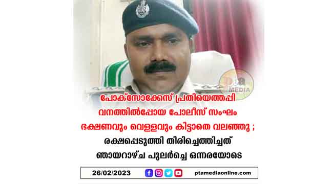 റാന്നി: പോക്സോ കേസ് പ്രതിയെ തെരഞ്ഞു പോയി വണ്ടിപ്പെരിയാര് ഗ്രാമ്പി വനമേഖലയില് ഉള്വനത്തില് കുടുങ്ങിയ പോലീസ് സംഘം തിരികെ ഇറങ്ങിയത് ഞായര് പുലര്ച്ചെ ഒന്നരയോടെ. ശനിയാഴ്ച രാവിലെ ഒമ്പതിന് അന്വേഷണത്തിനിറങ്ങിയ സംഘം ഭക്ഷണവും വെള്ളവും കിട്ടാതെ കാടിനുളളില് കുടുങ്ങുകയായിരുന്നു. ഒടുവില് ഫയര്ഫോഴ്സും പോലീസുമെത്തി ഭക്ഷണവും വെള്ളവും പ്രഥമശുശ്രൂഷയും നല്കി ഇവരെ തിരികെയെത്തിച്ചു.