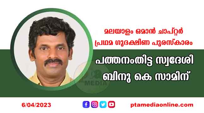Oman – മലയാളം ഒമാൻ ചാപ്റ്റർ ബഹുമുഖപ്രതിഭകളായ ഭാഷാധ്യാപകർക്ക് നൽകുന്ന പ്രഥമ ഗുരുദക്ഷിണ പുരസ്കാരം പത്തനംതിട്ട സെന്റ് മേരീസ് ഹൈസ്കൂൾ മലയാളം അധ്യാപകനും കുട്ടികളുടെ രാജ്യാന്തരപരിശീലകനും എഴുത്തുകാരനും വ്ളോഗറുമായ ബിനു കെ. സാമിന്. ഏപ്രിൽ 28ന് മലയാളം ഒമാൻ ചാപ്റ്റർ മസ്ക്കത്തിൽ സംഘടിപ്പിക്കുന്ന മലയാള മഹോത്സവത്തിൽ ഒരു ലക്ഷം രൂപയും പ്രശസ്തിപത്രവും ശിൽപവുമടങ്ങുന്ന പുരസ്കാരം സമർപ്പിക്കുമെന്ന് ചെയർമാൻ മുഹമ്മദ് അൻവർ ഫുല്ല, വൈസ് ചെയർമാൻ സദാനന്ദൻ എടപ്പാൾ, ജനറൽ സെക്രട്ടറി രതീഷ് പട്ടിയാത്ത് എന്നിവർ വാർത്തക്കുറിപ്പിൽ അറിയിച്ചു.