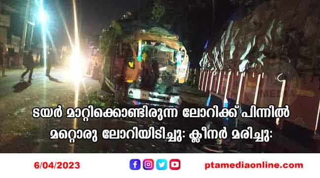 റോഡിന്റെ അരികില് ഇട്ട് ടയര് മാറ്റകയായിരുന്ന കെഎല് 21 1177 നമ്പര് ലോറിക്ക് പിന്നില് തമിഴ്നാട്ടില് നിന്ന് ഏത്തക്കുലയുമായി വന്ന ടിഎന് 69 ബിഎഫ് 7096 നമ്പര് ലോറി ഇടിച്ചു കയറുകയായിരുന്നു. ഈ ലോറിയുടെ ക്ലീനറാണ് മരണമടഞ്ഞ മുകഷേ്. പരുക്കേറ്റ ലോറി ഡ്രൈവര് പരവേശ മുത്തുവിനെ തിരുവല്ല താലൂക്ക് ആശുപത്രിയില് പ്രവേശിപ്പിച്ചു. മുകേഷിന്റെ മൃതദേഹം താലൂക്ക് ആശുപത്രി മോര്ച്ചറിയില്. അപകടത്തിൽപ്പെട്ട ലോറിയുടെ ക്യാബിനുള്ളിൽ കുടുങ്ങിപ്പോയ മുത്തിന്റെ മൃതദേഹം അഗ്നിരക്ഷാസേന എത്തി മുൻവശം വെട്ടിപ്പൊളിച്ചാണ് പുറത്ത് എടുത്തത്.
