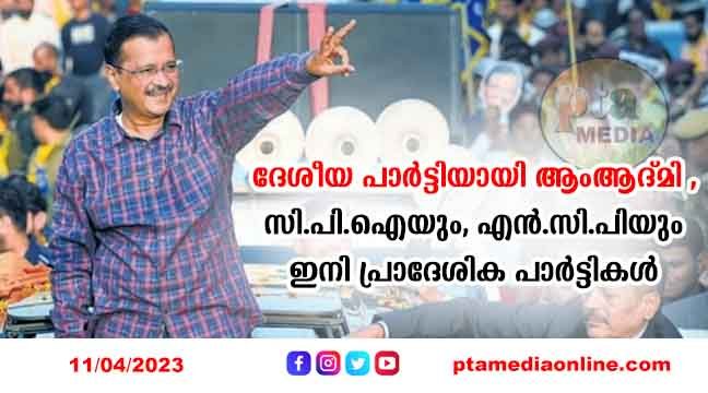 അതേസമയം പഞ്ചാഞ്ചിലും ഡൽഹിയിലും ഭരണകക്ഷിയാവുകയും ഗോവയിലും ഗുജറാത്തിലും നിയമസഭാ സീറ്റുകൾ നേടുകയും ചെയ്ത ആംആദ്മി പാർട്ടിക്ക് തിരഞ്ഞെടുപ്പ് കമ്മിഷൻ ദേശീയ പാർട്ടി പദവി നൽകി. ആംആദ്മി ഗുജറാത്തിൽ 12 ശതമാനം വോട്ടോടെ അഞ്ച് സീറ്റും, ഗോവയിൽ ആറു ശതമാനത്തിൽ കൂടുതൽ വോട്ടോടെ രണ്ടു സീറ്റുമാണ് നേടിയാണ് .