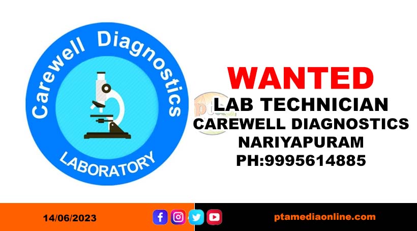 WANTED LAB TECHNICIAN Pathanamthitta June 14, 2023administratorLeave a Comment on WANTED LAB TECHNICIAN WANTED LAB TECHNICIAN CAREWELL DIAGNOSTICS NARIYAPURAM PH:9995614885 Spread the love