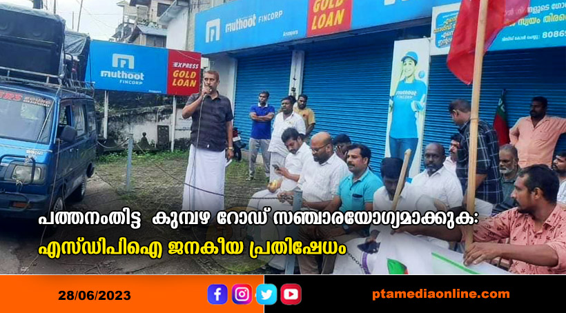പത്തനംതിട്ട : അപകടക്കുഴികൾ നിറഞ്ഞ പത്തനംതിട്ട – കുമ്പഴ റോഡ് സഞ്ചാരയോഗ്യമാക്കുക, ജനങ്ങളുടെ ജീവൻ രക്ഷിക്കുക എന്ന ആവശ്യമുയർത്തി ജനകീയ പ്രതിഷേധവും ധർണ്ണയും സംഘടിപ്പിച്ചു. കുലശേഖരപതി മദീന ജംഗ്ഷനിൽ നിന്നും ആരംഭിച്ച പ്രകടനം ആനപ്പാറ ജംങ്ഷനിൽ സമാപിച്ചു. പത്തനംതിട്ട നഗരസഭ സ്റ്റാൻഡിംഗ് കമ്മിറ്റി ചെയർമാൻ എസ് ഷമീർ ഉദ്ഘാടനം ചെയ്തു. എസ്ഡിപിഐ ആറൻമുള മണ്ഡലം സെക്രട്ടറി അബ്ദുൽ വഹാബ് അധ്യക്ഷത വഹിച്ചു. മുൻസിപൽ പ്രസിഡൻറ് നിയാസ് കൊന്നമൂട്, നഗരസഭാ കൗൺസിലർമാരായ എസ് ഷൈലജ, ഷീല എസ്, എസ്ഡിപിഐ ബ്രാഞ്ച് പ്രസിഡൻറ് അൻവർ, മുഹമ്മദ് സലീം എന്നിവർ സംസാരിച്ചു.