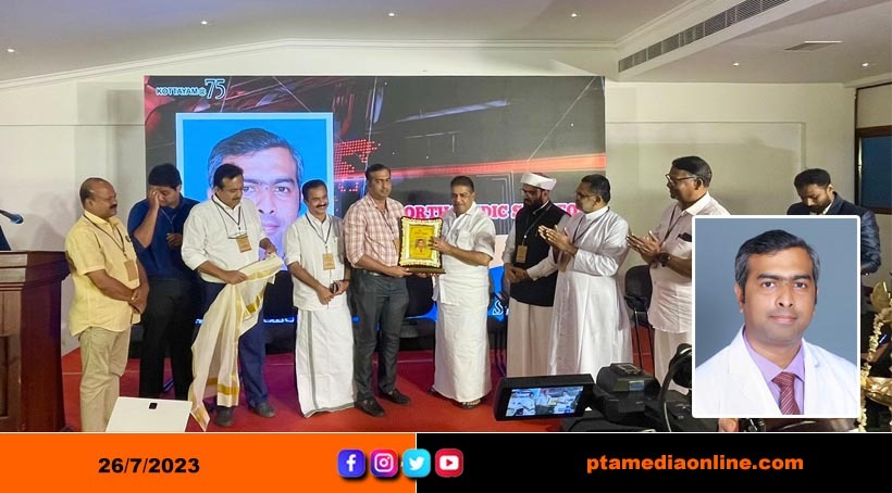 ചങ്ങനാശേരി: കോട്ടയം ജില്ലാ രൂപികരണ പ്ലാറ്റിനം ജൂബിലി ആഘോഷങ്ങളുടെ ഭാഗമായി ചങ്ങനാശ്ശേരി കൊണ്ടൂർ റിസോർട്ടിൽ നടന്ന പ്രൗഢഗംഭീരമായ ചടങ്ങിൽ മുട്ടുമാറ്റി വെയ്ക്കൽ ശസ്ത്രക്രിയ വിധഗ്ദ്ധനും കേരളത്തിൽ ആദ്യമായി ടോട്ടൽ ടാലസ് റീപ്ലേസ്മെൻ്റ് സർജറി നടത്തിയ ഡോ.ജെഫേഴ്സൺ ജോർജിന് മന്ത്രി സജി ചെറിയാൻ പുരസ്ക്കാരം നല്കി അനുമോദിച്ചു. മന്ത്രി മുഹമ്മദ് റിയാസ്, മന്ത്രി വീണാ ജോർജ്ജ്, ജോബ് മൈക്കിൾ എംഎൽഎ എന്നിവർ പങ്കെടുത്തു.