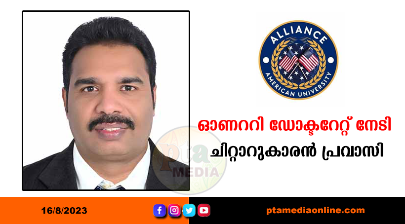 അലയൻസ് അമേരിക്കൻ യൂണിവേഴ്സിറ്റിയുടെ ഓണററി ഡോക്ടറേറ്റ് നേടി ചിറ്റാറുകാരൻ പ്രവാസി