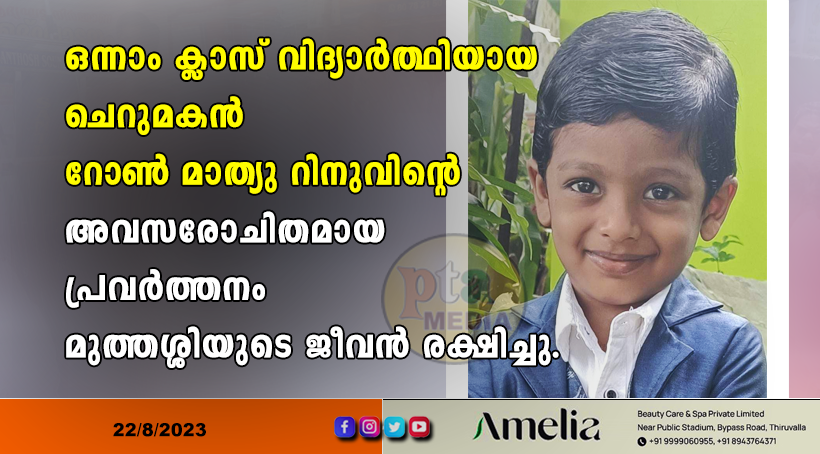 ഒന്നാം ക്ലാസ് വിദ്യാർത്ഥിയായ ചെറുമകൻ റോൺ മാത്യു റിനുവിന്റെ അവസരോചിതമായ പ്രവർത്തനം മുത്തശ്ശിയുടെ ജീവൻ രക്ഷിച്ചു.