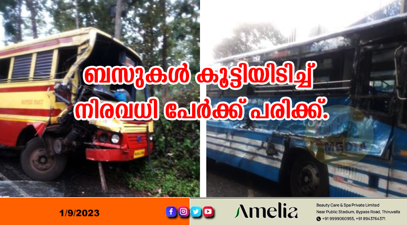മുണ്ടക്കയം ഭാഗത്ത് നിന്ന് കണ്ണൂർ കൊന്നക്കാടിന് പോയ കെഎസ്ആർടിസി സൂപ്പർഫാസ്റ്റ് ബസ് എതിർദിശയിൽ വന്ന സ്വകാര്യ ബസുമായി കൂട്ടിയിടിക്കുകയായിരുന്നു. കെഎസ്ആർടിസി ബസിൽ ഇടിച്ച സ്വകാര്യ ബസ് റോഡ് വക്കിലെ മാടക്കടയും റോഡരികിൽ പാർക്ക് ചെയ്തിരുന്ന ഇരുചക്രവാഹനങ്ങളും ഇടിച്ച്ച തെറിപ്പിച്ചാണ് നിന്നത്. ഈ കടയിൽ ഉണ്ടായിരുന്നവർക്കും ഇരുബസുകളിലും യാത്ര ചെയ്തിരുന്നവർക്കുമാണ് പരിക്കേറ്റിട്ടുള്ളത്. ഇവരെ സമീപത്തുള്ള ആശുപത്രികളിൽ പ്രവേശിപ്പിച്ചു.