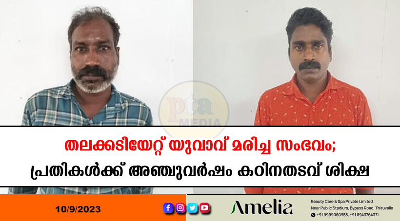 പത്തനംതിട്ട: തലക്കടിയേറ്റ് യുവാവ് മരിച്ച സംഭവത്തിൽ പ്രതികളായ സഹോദരങ്ങൾക്ക് അഞ്ചുവർഷം കഠിനതടവും 31000 രൂപ വീതം പിഴയും. പത്തനംതിട്ട അഡീഷണൽ സെഷൻസ് കോടതിയാണ് ശിക്ഷ വിധിച്ചത്. കീഴ് വായ്പൂർ പൊലീസ് 2013-ൽ രജിസ്ട്രർ ചെയ്ത കേസിലാണ് വിധി. കല്ലുപ്പാറ സ്വദേശികളായ അഭിലാഷ്(36), അശോകൻ(32) എന്നിവരെയാണ് കോടതി ശിക്ഷിച്ചത്.