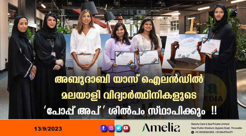 അബുദാബി – യാസ് ഐലൻഡിൽ വിനോദസഞ്ചാരികളെ ആകർഷിക്കാനായി അറബ് സംസ്കാരത്തിന്റെ പ്രതീകമായ കടലും മുത്തും കരുത്തുറ്റ കൈകളും മാതൃകയാക്കി മലയാളി വിദ്യാർത്ഥിനികൾ ഡിസൈൻ ചെയ്ത ‘പോപ്പ്-അപ്’ ത്രീഡി ശിൽപം സ്ഥാപിക്കും. ഈ മനോഹര ത്രിമാന മാതൃക രൂപകൽപ്പന ചെയ്തത് ദുബായ് അമിറ്റി സർവകലാശാലയിൽ ഇന്റീരിയർ ഡിസൈൻ പഠിക്കുന്ന മൂന്നു മലയാളി വിദ്യാർത്ഥിനികളാണ്.