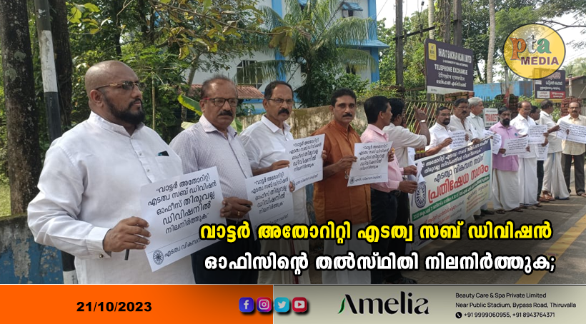 എടത്വ: വാട്ടർ അതോറിറ്റി എടത്വ സബ് ഡിവിഷൻ ഓഫീസ് തിരുവല്ല ഡിവിഷൻ്റെ കീഴിൽ തന്നെ നിലനിർത്തണമെന്ന് ആവശ്യപ്പെട്ട് എടത്വ വാട്ടർ അതോറിട്ടി ഓഫീസ് പ്രവർത്തിക്കുന്ന ബി എസ് എൻ എൽ ഓഫീസ് കെട്ടിടത്തിന്റെ മുമ്പിൽ എടത്വ വികസന സമിതി പ്രതിഷേധ സമരം സംഘടിപ്പിച്ചു.എടത്വ വികസന സമിതി പ്രസിഡൻ്റ് ആൻ്റണി ഫ്രാൻസിസ് കട്ടപ്പുറം ഉദ്ഘാടനം ചെയ്തു.വൈസ് പ്രസിഡൻ്റ് ഷാജി തോട്ടുകടവിൽ അധ്യക്ഷത വഹിച്ചു.വൈസ് പ്രസിഡൻ്റ് അഡ്വ. ഐസക്ക് രാജു മുഖ്യ സന്ദേശം നല്കി.ഭൂമി ശാസ്ത്രപരം, യാത്ര സൗകര്യം, കുടിവെള്ള ലഭ്യത, നിലവിലുള്ള പദ്ധതി പ്രവർത്തനങ്ങളുടെ പൂർത്തികരണം, കുട്ടനാട്ടിലെ ശുദ്ധജല ക്ഷാമത്തിന് പരിഹാരം എന്നീ വിഷയങ്ങൾ കണക്കിലെടുത്ത് ഉത്തരവിലെ തീരുമാനം പുനപരിശോധിച്ച് എടത്വ സബ് ഡിവിഷൻ തിരുവല്ല ഡിവിഷൻ്റെ കീഴിൽ തന്നെ നിലനിർത്തണമെന്ന് ആവശ്യപെട്ടു.
