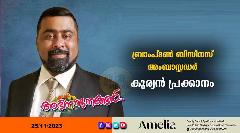 കാനഡയിൽ മെച്ചപ്പെട്ട ജീവിത സാഹചര്യം തേടി കുടിയേറ്റം തുടങ്ങി പതിറ്റാണ്ടുകൾ കഴിഞ്ഞിട്ടും മലയാളികയുടെ ശക്തമായ സാനിധ്യം കാനഡിയൻ മുഖ്യധാര രാഷ്ട്രീയത്തിൽ കൊണ്ട് വരാൻ നമ്മൾ മലയാളികൾ ഏറെ വിഷമിച്ചു. ഈ അവസരത്തിൽ ആണ് കേരളത്തിന്റെ സാംസ്കാരിക പാരമ്പര്യമായ വള്ളം കളി കാനഡയിൽ ചങ്ക്ഊറ്റത്തോടെ brampton നെഹ്റു ട്രോഫി വള്ളം കളി എന്ന നാമത്തിൽ 14 വർഷം മുൻപ് അവതരിപ്പിക്കുകയും, ഇന്നും തുടരുകയും, അതിനു കാനഡയിലെ രാഷ്ട്രീയ ഭേദമന്യേ ഫെഡറൽ, പ്രൊവിൻഷ്യൽ( സംസ്ഥാന), റീജിയണൽ സർക്കാറുകൾ , ജനപ്രതിനിധികൾ, മലയാളി ഇതര ഇന്ത്യൻ ജനസമൂഹങ്ങൾ മാത്രമല്ല, മറ്റു ലോക രാജ്യങ്ങളിൽ നിന്നുള്ള സമൂഹങ്ങളും, തങ്ങളുടെ സാംസ്കാരിക ഉത്സവമായി ഇരു കൈയും നീട്ടി സ്വീകരിക്കുകയും, ചെയ്തു. ഇതിന്റെ അമരക്കാരനായ മലയാളി ശ്രീ കുര്യൻ പ്രക്കാനം ഇന്ന് brampton ബിസിനസ് അംബാസ്സഡർ ആയി , brampton സിറ്റി mayor ഉൾപ്പെടുന്ന സിറ്റി കൗൺസിൽ തിരഞ്ഞെടുക്കുകയും ചെയ്തു എന്നത് ലോകമെമ്പാടും ഉള്ള ഏതൊരു മലയാളിക്കും അഭിമാനർഹമായ നേട്ടം ആണ്. ഈ അവസരം അദ്ദേഹത്തിന് കാനഡയൻ മലയാളികളുടെ പേരിൽ ആശംസകൾ അറിയിക്കാനും, ഇനിയും വളരെ ഉന്നതികളിൽ മലയാളികളുടെ ശബ്ദമായി മാറാൻ അദ്ദേഹത്തിന് കഴിയട്ടെ എന്നും സമാജം ബോർഡ് ഓഫ് ട്രസ്റ്റീ ചെയര് ബ്രഹ്മശ്രീ കരിയന്നൂർ ദിവാകരൻ നമ്പൂതിരി, bot അംഗങ്ങൾ ആയ മനോജ് കരാത്താ, ലത മേനോൻ ,സജീബ് കോയ ,ഡോ നിഗിൽ ഹാറൂൺ എന്നിവർ അഭിപ്രായപ്പെട്ടു . സമജം മാത്രമല്ല എല്ലാ കനേഡിയൻ മലയാളികളും ഈ നേട്ടത്തില് അഭിമാനിക്കുന്നു എന്ന് ജനറൽ സെക്രട്ടറി ബിനു ജോഷ്വാ, യോഗേഷ് ഗോപകുമാർ