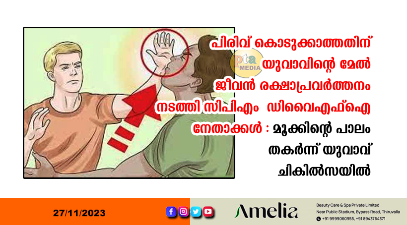 അടൂര് – സിപിഎം ലോക്കല് സെക്രട്ടറി വന്നു പിരിവു ചോദിച്ചപ്പോള് കൊടുത്ത തുക കുറഞ്ഞു പോയതിന്റെ പേരില് മണ്ണെടുപ്പുകാരന്റെ മൂക്കിന്റെ പാലം ഡിവൈഎഫ്ഐ മേഖലാ സെക്രട്ടറി ഇടിച്ചു തകര്ത്തുവെന്ന് പരാതി. പൊലീസില് പരാതി നല്കിയിട്ടും കേസെടുക്കാന് വൈകിയെന്നും ആക്ഷേപം.