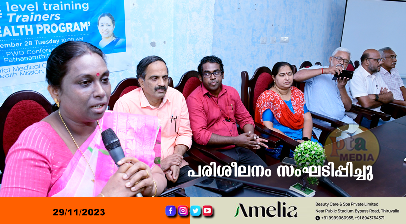 പത്തനംതിട്ട – ഏകാരോഗ്യപദ്ധതിയുടെ പരിശീലകർക്കായുള്ള പരിശീലനപരിപാടിയുടെ ജില്ലാതല ഉദ്ഘാടനം പത്തനംതിട്ട പിഡബ്ല്യുഡി റസ്റ്റ് ഹൗസിൽ ജില്ലാ മെഡിക്കൽ ഓഫീസർ (ആരോഗ്യം) ഡോ.എൽ. അനിതകുമാരി നിർവഹിച്ചു. ജില്ലയിൽ 52521 ആരോഗ്യവാളണ്ടിയർമാർക്കുള്ള പരിശീലനത്തിന് മുന്നോടിയായിട്ടാണ് പരിശീലകർക്കായുള്ള പരിശീലനം നടത്തിയത്. ജില്ലാ സർവെയിലൻസ് ഓഫീസർ ഡോ. സി എസ് നന്ദിനി, ലോകബാങ്ക് പ്രതിനിധി സതീഷ്, കില ഫാക്കൽറ്റി അംഗങ്ങളായ സി പി സുരേഷ് കുമാർ, ദിനേശ്, സിബി അഗസ്റ്റിൻ, ആർദ്രം നോഡൽ ആഫീസർ ഡോ. അംജിത്ത് രാജീവൻ, ബ്ലോക്ക് മെഡിക്കൽ ഓഫീസർമാർ, പൊതുജനാരോഗ്യവിഭാഗം ജീവനക്കാർ, നാഷണൽ ഹെൽത്ത് മിഷൻ പിആർഒമാർ, ഏകാരോഗ്യം പദ്ധതിയുടെ ജില്ലാതല മെന്റർമാർ എന്നിവർ പരിപാടിയിൽ പങ്കെടുത്തു.