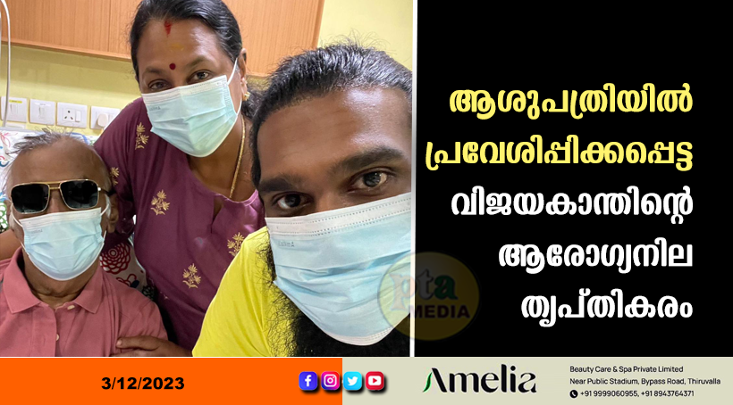 വിജയകാന്തിന്റെ ആരോഗ്യനില തൃപ്തികരമാണ്. ചില യൂട്യൂബറന്മാർ പറയുന്നത് പോലെ അദ്ദേഹം വെന്റിലേറ്ററിന്റെ സഹായത്തോടെയല്ല കഴിയുന്നത്. ഉടൻ വീട്ടിലേക്ക് മടങ്ങും. ദയവ് ചെയ്ത് തെറ്റായ വാർത്തകൾ പ്രചരിപ്പിക്കരുത്- പ്രേമലത വിജയകാന്ത് പറഞ്ഞു. വിജയകാന്തിന്റെ മകൻ നടന്റെ ആശുപത്രിയിൽ നിന്നുള്ള ഏറ്റവും പുതിയ ചിത്രം സമൂഹമാധ്യമങ്ങളിൽ പങ്കുവെച്ചിട്ടുണ്ട്.