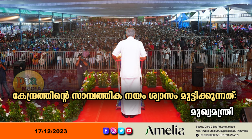 റാന്നി – കേന്ദ്രത്തിന്റെ സാമ്പത്തിക നയം ശ്വാസം മുട്ടിക്കുന്നതാണെന്ന് മുഖ്യമന്ത്രി പിണറായി വിജയൻ പറഞ്ഞു. റാന്നി നിയോജകമണ്ഡലം നവകേരള സദസ്സിനെ മാർ സേവിയസ് ഹയർ സെക്കൻഡറി സ്കൂൾ അങ്കണത്തിൽ സജ്ജീകരിച്ച വേദിയിൽ അഭിസംബോധന ചെയ്തു സംസാരിക്കുകയായിരുന്നു മുഖ്യമന്ത്രി.