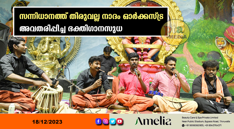 ഇന്ന് വൈകീട്ട് (18.12.23) സന്നിധാനം ആഡിറ്റോറിയത്തിൽ തിരുവല്ല നാദം ഓർക്കസ്ട്ര അവതരിപ്പിച്ച ഭക്തിഗാനസുധ . ആർ എൽ വി സനോജ് പുറമറ്റം , ഗണേഷ് തിരുവല്ല , വിജേഷ് തിരുവനന്തപുരം , സനൽ കൊല്ലം എന്നിവർ ഗാനങ്ങൾ ആലപിച്ചു. കീ ബോർഡ് ഗിരീഷ് കൊല്ലം , കമ്പോസർ ടൈറ്റസ് ശാസ്താംകോട്ട , തബല ദിനു കൊല്ലം എന്നിവർ അണിനിരന്നു. വീഡിയോ കാണാം…