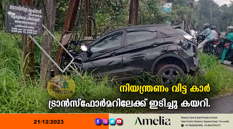 നിയന്ത്രണം വിട്ട കാർ ട്രാൻസ്ഫോർമറിലേക്ക് ഇടിച്ചു കയറി.