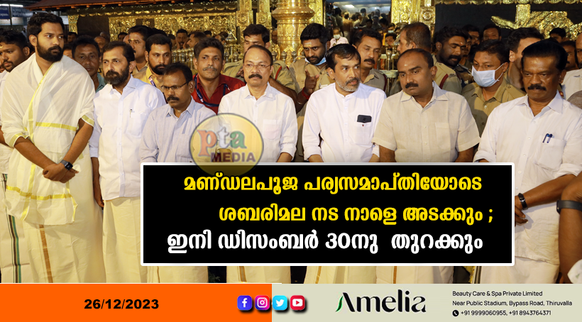 സന്നിധാനം – 41ദിവസം നീണ്ടുനിന്ന ശബരിമല മണ്ഡലകാല തീർഥാടനത്തിനു നാളെ (ഡിസംബർ 27) പരിസമാപ്തി. നാളെ രാവിലെ 10.30നും 11.30നും ഇടയിലുള്ള മുഹൂർത്തത്തിലാണ് തങ്ക അങ്കി ചാർത്തിയുള്ള മണ്ഡലപൂജ. രാത്രി 11.00 മണിക്ക് ഹരിവരാസനം പാടി അടയ്ക്കുന്ന നട ഡിസംബർ 30ന് വൈകിട്ട് അഞ്ചു മണിക്കു മകരവിളക്ക് ഉത്സവത്തിനായി തുറക്കും. ജനുവരി 15നാണ് മകരവിളക്ക്. സ്വാമിശരണം.
