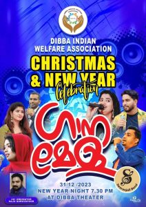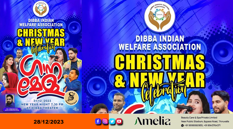 ഫുജൈറ – ദിബ്ബയിലെ പ്രവാസി സുഹൃത്തുക്കളുടെ കൂട്ടായ്മയായ ദിബ്ബ ഇന്ത്യൻ വെൽഫെയർ അസോസിയേഷൻ -DIWA ASSOCIATION സംഘടപ്പിക്കുന്ന ക്രിസ്മസ് ന്യൂ ഇയർ ആഘോഷം 31/12/2023 ദിബ്ബ തിയേറ്ററിൽ നടക്കുന്നു. ഞയറാഴ്ച രാത്രി 7.30 ന് തുടങ്ങുന്ന പരിപാടിയിലേക്ക് എല്ലാവരെയും സ്വാഗതം ചെയ്യുന്നതായി സംഘാടകർ അറിയിച്ചു.