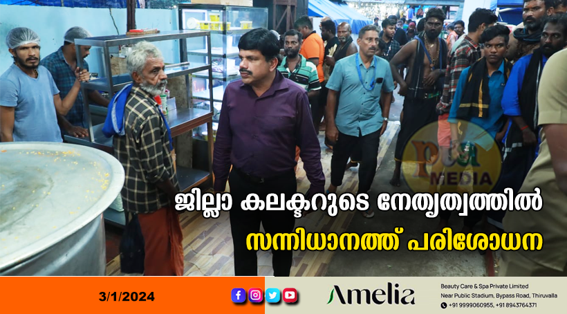 സന്നിധാനം – മകരവിളക്ക് മഹോത്സവത്തിന്റെ മുന്നോടിയായി പത്തനംതിട്ട ജില്ലാ കലക്ടർ എ ഷിബുവിന്റെ നേതൃത്വത്തിൽ സന്നിധാനത്ത് പരിശോധന നടത്തി. ഹോട്ടലുകൾ, ആശുപത്രികൾ, അരവണ – അപ്പം നിർമ്മാണ കേന്ദ്രങ്ങൾ എന്നിവിടങ്ങളിലാണ് കലക്ടർ സന്ദർശിച്ച് പ്രവർത്തനങ്ങൾ