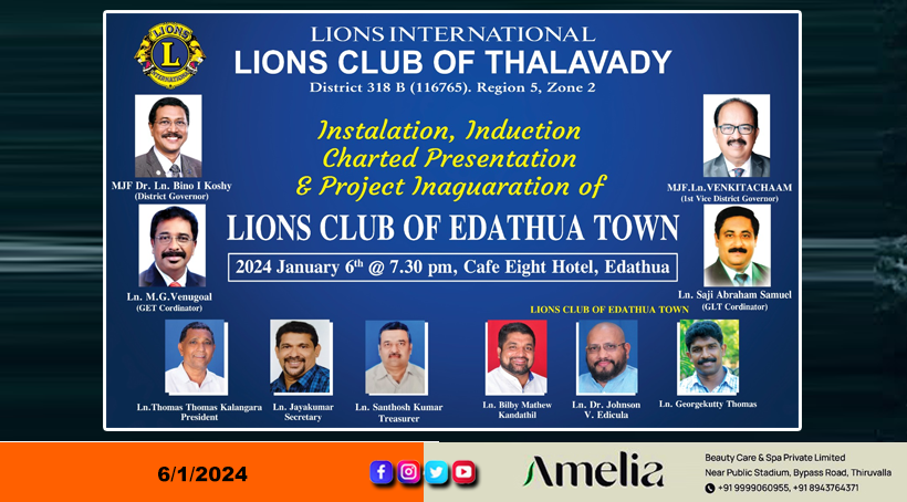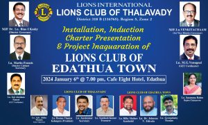 എടത്വ: ലയൺസ് ക്ലബ് ഇന്റർനാഷണൽ എടത്വ ടൗൺ ഭാരവാഹികളുടെ സ്ഥാനാരോഹണം ഇന്ന് വൈകിട്ട് 7ന് എടത്വ കഫേഎയിറ്റ് ഹോട്ടലിൽ നടക്കും.