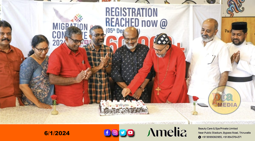 തിരുവല്ല: തിരുവല്ലയിൽ ജനുവരി 18 മുതൽ 21 വരെ നടക്കുന്ന ആഗോള മലയാളി പ്രവാസി സംഗമമായ മൈഗ്രേഷൻ കോൺക്ലേവിൽ പങ്കെടുക്കുന്നവരുടെ രജിസ്ട്രേഷൻ അറുപതിനായിരം കടന്നതിനെ തുടർന്ന് സംഘാടക സമിതിയുടെ നേതൃത്വത്തിൽ കേക്ക് മുറിച്ച് ആഘോഷിച്ചു. തിരുവല്ല ബിഗ് മൗത്ത് റെസ്റ്റോറൻ്റ് ഹാളിൽ നടന്ന ചടങ്ങിൽ ഡോ: ഗീവർഗീസ് മാർ കൂറിലോസ് മെത്രാപോലീത്ത കേക്ക് മുറിച്ച് മധുരം പകർന്നു. സംഘാടക സമിതി ചെയർമാൻ ബന്യാമീൻ അധ്യക്ഷനായി.മാത്യു ടി തോമസ് എംഎൽഎ, പത്തനംതിട്ട നഗരസഭാ ചെയർമാൻ സക്കീർ ഹുസൈൻ, രക്ഷാധികാരി ഡോ. ടി എം തോമസ് ഐസക്, ജനറൽ കൺവീനർ എ പത്മകുമാർ, കെ പി ഉദയഭാനു, രാജുഏബ്രഹാം, മുൻ ദേവസ്വം ബോർഡ് പ്രസിഡൻ്റ് അഡ്വ. കെ അനന്തഗോപൻ, ബിലീവേഴ്സ് ചർച്ച് ആശുപത്രി മാനേജർ ഫാ: സിജോ പന്തപ്പള്ളിൽ, വനിതാ കമ്മീഷൻ അംഗം അഡ്വ.എലിസബത്ത് മാമൻ മത്തായി, പി ആർ പ്രസാദ്, അഡ്വ.ആർ സനൽകുമാർ, അഡ്വ.ഫ്രാൻസിസ് വി ആൻ്റണി, ജോയിൻ്റ് കൺവീനർ റോഷൻ റോയ് മാത്യു, ഫാ: ഏബ്രഹാം മുളമൂട്ടിൽ, അഡ്വ. എൻ രാജീവ്, വിവിധ സബ് കമ്മറ്റി കൺവീനർമാരായ അഡ്വ. സുധീഷ് വെൺപാല, ഡോ: റാണി ആർ നായർ, സജുകുമാർ, ജോർജ് വർഗീസ്, ടി എ റെജി കുമാർ, പ്രിൻസ് വലിയ കാലാ, പ്രമോദ് ഇളമൺ എന്നിവർ സംസാരിച്ചു.
