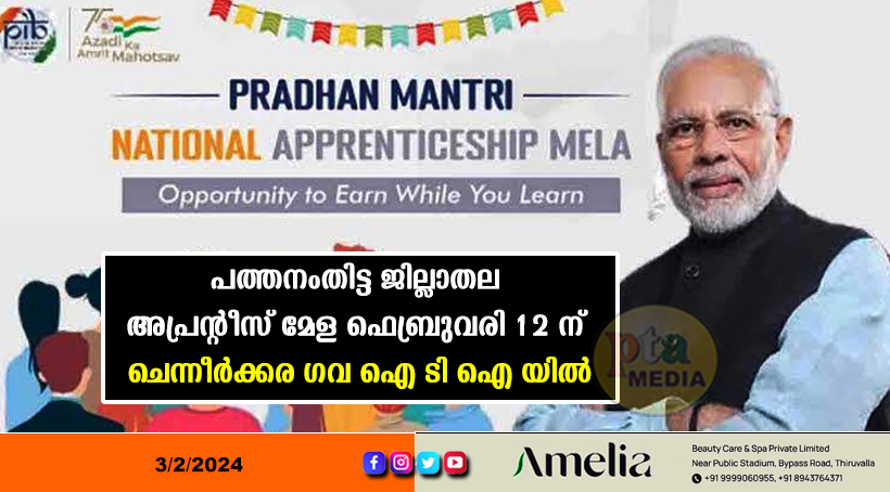പത്തനംതിട്ട – പ്രധാനമന്ത്രി നാഷണൽ അപ്രന്റീസ് മേളയോടനുബന്ധിച്ച് പത്തനംതിട്ട ജില്ലാതല അപ്രന്റീസ് മേള ഫെബ്രുവരി 12 ന് ചെന്നീർക്കര ഗവ ഐ ടി ഐ യിൽ നടക്കും. വിവിധ സർക്കാർ / അർദ്ധ സർക്കാർ / സ്വകാര്യ മേഖലകളിലെ സ്ഥാപനങ്ങൾ മേളയിൽ പങ്കെടുക്കും. ഒരു വർഷത്തേക്കാണ് നിയമനം. ഐ ടി ഐ പാസായവരും മുൻകാലങ്ങളിൽ അപ്രന്റീസ്ഷിപ്പിൽ ഏർപ്പെടാതിരുന്ന ട്രെയിനികൾക്കും പങ്കെടുക്കാം. താൽപര്യമുള്ളവർ ട്രേഡ് സർട്ടിഫിക്കറ്റ്, ആധാർ, ഫോട്ടോ, മറ്റ് അനുബന്ധ രേഖകളുമായി എത്തണം.