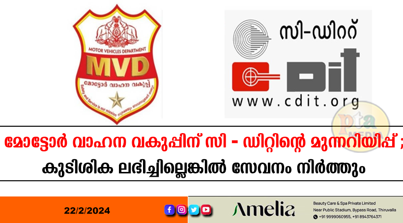 തിരുവനന്തപുണരാം – കുടിശിക പണം നൽകിയില്ലെങ്കിൽ സേവനം നിർത്തിവയ്ക്കുമെന്ന് മോട്ടോർ വാഹന വകുപ്പിന് സി-ഡിറ്റിൻ്റെ മുന്നറിയിപ്പ്. 6.58 കോടി രൂപയാണ് സി-ഡെറ്റിന് വകുപ്പ് നൽകാനുള്ളത്. ഫെബ്രുവരി അവസാനത്തോടെ കുടിശ്ശിക നൽകണമെന്നും അല്ലെങ്കിൽ സർവീസ് അവസാനിപ്പിക്കുമെന്നും സി-ഡിറ്റ് മുന്നറിയിപ്പ് നൽകി.2010 മുതൽ നടപ്പിലാക്കിവരുന്ന ഫെസിലിറ്റി മാനേജ്മെൻറ് പ്രോജക്ടിൻ്റെ കരാർ കാലാവധി പലതവണ ദീർഘിപ്പിച്ചിട്ടുണ്ടെങ്കിലും കരാർ പ്രകാരമുള്ള തുക ഇതുവരെ കൈമാറിയിട്ടില്ല. വിവിധ മേഖലകളിൽ ചെലവ് പതിന്മടങ്ങ് വർദ്ധിപ്പിച്ചിട്ടും പഴയ ഉടമ്പടി പ്രകാരമാണ് പ്രോജക്ട് നടന്നുവരുന്നത്. വകുപ്പിൽ നിന്ന് എഫ്എംഎസ് പ്രോജക്ട് നടത്തിപ്പിന്റെ ഭാഗമായി 2023 ജനുവരി മാസം വരെയുള്ള തുക മാത്രമാണ് ഇതുവരെ ലഭ്യമായിട്ടുള്ളതെന്നും സി-ഡിറ്റ് കത്തിൽ പറയുന്നു.