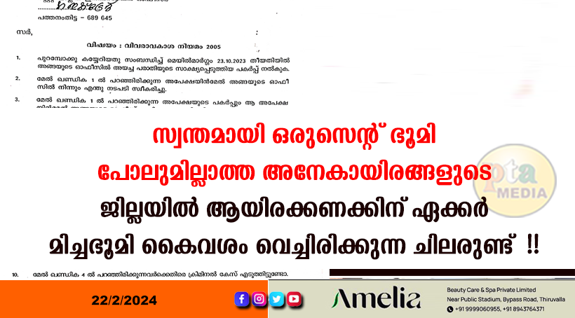 പത്തനംതിട്ട :- സ്വന്തമായി ഒരു സെന്റ് ഭൂമിയില്ലാതെ അനേകം പേർ വാടക വീടുകളിൽ അഭയം പ്രാപിക്കുമ്പോൾ ജില്ലയിൽ 47 പേരുടെ പക്കൽ നിയമാനുസൃതം കൈവശം വയ്ക്കേണ്ട ഭൂമിയെക്കാൾ കൂടുതൽ ഭൂമിയുള്ളതായി വിവരാവകാശ രേഖ.