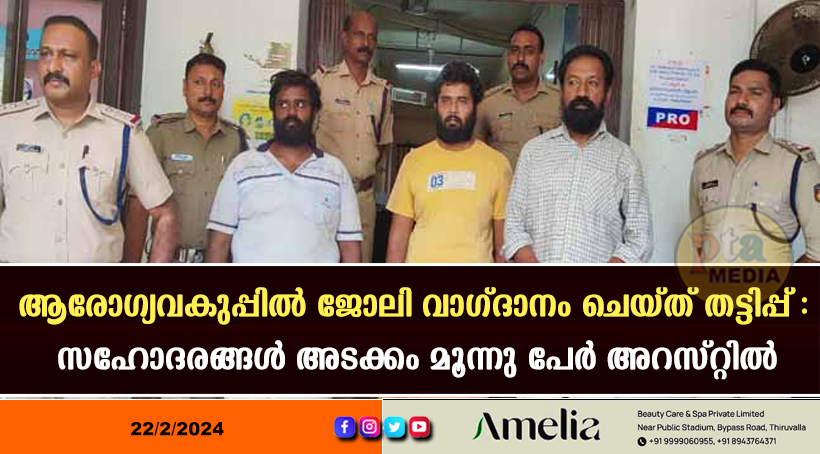 അടൂര് – ആരോഗ്യവകുപ്പില് ജോലി വാഗ്ദാനം ചെയ്ത് പണം കൈപ്പറ്റിയ ശേഷം വ്യാജ നിയമന ഉത്തരവ് നല്കി വഞ്ചിച്ചുവെന്ന പരാതിയില് എന്സിപി ബ്ലോക്ക് കുണ്ടറ ബ്ലോക്ക് പ്രസിഡന്റ് അടക്കം മൂന്നു പേര് പിടിയില്. ഒമ്പതു ലക്ഷം രൂപ നഷ്ടമായ മലമേക്കര സ്വദേശിനിയുടെ പരാതിയുടെ അടിസ്ഥാനത്തില് കൊല്ലം പെരിനാട് വെള്ളിമണ് വിനോദ് ഭവനില് വിനോദ് ബാഹുലേയന് (50), നൂറനാട് ഐരാണിക്കുടി ചെറുമുഖ രോഹിണി നിലയത്തില് മുരുകദാസ് കുറുപ്പ് (29), സഹോദരന് അയ്യപ്പദാസ് കുറുപ്പ് (22) എന്നിവരെയാണ് അടൂര് പോലീസ് ഇന്സ്പെക്ടറുടെ നേതൃത്വത്തിലുള്ള അനേ്വഷണ സംഘം അറസ്റ്റ് ചെയ്തത്. ഒന്നാം പ്രതി വിനോദ് എന്.സി.പി കുണ്ടറ ബ്ലോക്ക് പ്രസിഡന്റാണ്. കഴിഞ്ഞ നിയമസഭ തെരഞ്ഞെടുപ്പില് കുണ്ടറയില് ആര്.ജെ.ഡി സ്ഥാനാര്ഥിയായി മത്സരിച്ചു. മുന്പ് ബി.ഡി.ജെ.എസ് ജില്ലാ വൈസ് പ്രസിഡന്റുമായിരുന്നു.