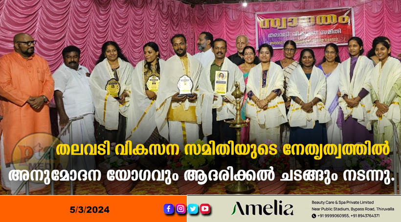 എടത്വ: തലവടി വികസന സമിതിയുടെ നേതൃത്വത്തിൽ അനുമോദന യോഗവും ആദരിക്കൽ ചടങ്ങും നടന്നു. ചെയർമാൻ ബ്രഹ്മശ്രീ നീലകണ്ഠരര് ആനന്ദൻ നമ്പൂതിരി അധ്യക്ഷത വഹിച്ചു. ബ്ലോക്ക് പഞ്ചായത്ത് പ്രസിഡന്റ് ജിൻസി ജോളി ഉദ്ഘാടനം ചെയ്തു.