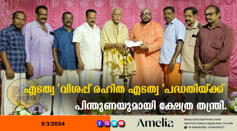 എടത്വ: ലയൺസ് ക്ലബ് ഓഫ് എടത്വ ടൗണിൻ്റെ ‘വിശപ്പ് രഹിത എടത്വ ‘ പദ്ധതിയ്ക്ക് പിന്തുണയുമായി ക്ഷേത്ര തന്ത്രി. തലവടി തിരുപനയനൂർ കാവ് ത്രിപുര സുന്ദരി ക്ഷേത്രം മുഖ്യ തന്ത്രി ബ്രഹ്മശ്രീ നീലകണ്ഠര് ആനന്ദ് പട്ടമന യാണ് ‘വിശപ്പ് രഹിത എടത്വ ‘ പദ്ധതിക്ക് ആദ്യ സംഭാവനയുമായി എത്തിയത്.ക്ഷേത്രതന്ത്രിയുടെ 73-ാം ജന്മദിന ആഘോഷ ചടങ്ങിൽ വെച്ചാണ് ആദ്യ സംഭാവന സെക്രട്ടറി ഡോ.ജോൺസൺ വി.ഇടിക്കുള സ്വീകരിച്ചത്.ക്ഷേത്ര ഓഡിറ്റോറിയത്തിൽ നടന്ന ചടങ്ങിൽ മാനേജർ അജികുമാർ കലവറശ്ശേരിൽ അധ്യക്ഷത വഹിച്ചു.രതീഷ് പതിനെട്ടിൽചിറ, കെ. ജെ തോമസ്, മോഹന്നൻ തെന്നശ്ശേരി, രഘുനാഥ്,മനോഹരൻ വെറ്റിലക്കണ്ടം, സുരേഷ് പതിനെട്ടിൽ, ഗിരിജ ആനന്ദ് പട്ടമന , റ്റിഎൻ. ഹരികുമാർ എന്നിവർ ആശംസകൾ അർപ്പിച്ചു.