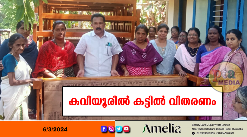 തിരുവല്ല – കവിയൂർ ഗ്രാമപഞ്ചായത്ത് 2023-24 സാമ്പത്തിക വർഷം നടപ്പിലാക്കുന്ന വയോജനങ്ങൾക്ക് കട്ടിൽ പദ്ധതിയുടെ ഭാഗമായി കട്ടിൽ വിതരണം ചെയ്തു. വിതരാണോദ്ഘാടനം ഗ്രാമപഞ്ചായത്ത് പ്രസിഡന്റ് എം ഡി ദിനേശ് കുമാർ നിർവഹിച്ചു. 3,81,500 രൂപ ചിലവ് ചെയ്ത് 104 പേർക്കാണ് കട്ടിൽ നൽകിയത്. ഗ്രാമ പഞ്ചായത്ത് വൈസ് പ്രസിഡന്റ് ശ്രീരഞ്ജിനി ഗോപി അധ്യക്ഷത വഹിച്ച ചടങ്ങിൽ ക്ഷേമകാര്യ സ്റ്റാൻഡിങ് കമ്മിറ്റി ചെയർപേഴ്സൺ ശ്രീകുമാരി രാധാകൃഷ്ണൻ ഗ്രാമപഞ്ചായത്ത് അംഗങ്ങളായ സിന്ധു ആർ സി നായർ, കെ .ആർ രാജശ്രീ, അനിതാ സജി, വി എസ് സിന്ധു, റേയ്ച്ചൽ.വി .മാത്യു, ഐസിഡിഎസ് സൂപ്പർവൈസർ എസ് രേഖ, അംഗൻവാടി വർക്കർമാരായ കെ.ജി ശ്രീനാ, ഉമാദേവി തുടങ്ങിയവർ പങ്കെടുത്തു.