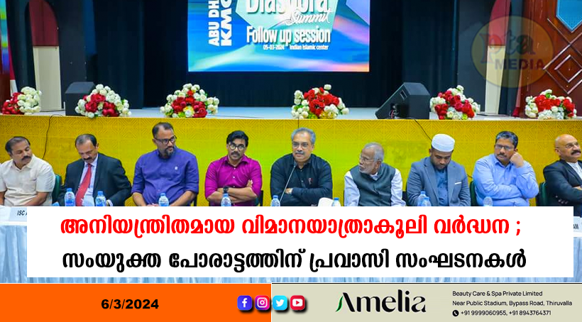 അബുദാബി: അനിയത്രിതമായ വിമാനയാത്രാകൂലി വർദ്ധനവിനെതിരെ അബുദാബിയിലെ പ്രവാസി സംഘടനകൾ സംയുക്ത പോരാട്ടത്തിനൊരുങ്ങുന്നു. അബുദാബി കെഎംസിസിയുടെ നേതൃത്വത്തിൽ സംഘടിപ്പിച്ച ഡയസ്‌പോറ സമ്മിറ്റിന്റെ തുടർ ചർച്ചകൾക്കായി കൂടിയ യോഗത്തിലാണ് ഇത് സംബന്ധിച്ച നിർദ്ദേശം മുന്നോട്ടു വെച്ചത്. പരിപാടിയിൽ അബുദാബിയിലെ മുപ്പതോളം സംഘടനാ പ്രതിനിധികൾ പങ്കെടുത്തു. യോഗത്തിൽ അബുദാബി കെഎംസിസി പ്രസിഡന്റ് ഷുക്കൂർഅലി കല്ലുങ്ങൽ അധ്യക്ഷത വഹിച്ചു. ഇന്ത്യൻ സോഷ്യൽ ആന്റ് കൾച്ചറൽ സെന്റർ പ്രസിഡന്റ് ജോൺ പി വർഗീസ് ഉദ്ഘാടനം ചെയ്തു.