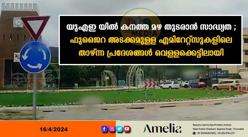 യുഎഇ യിൽ കനത്ത മഴ തുടരാൻ സാദ്ധ്യത ; ഫുജൈറ അടക്കമുള്ള എമിറേറ്റ്സുകളിലെ താഴ്ന്ന പ്രദേശങ്ങൾ വെള്ളക്കെട്ടിലായി