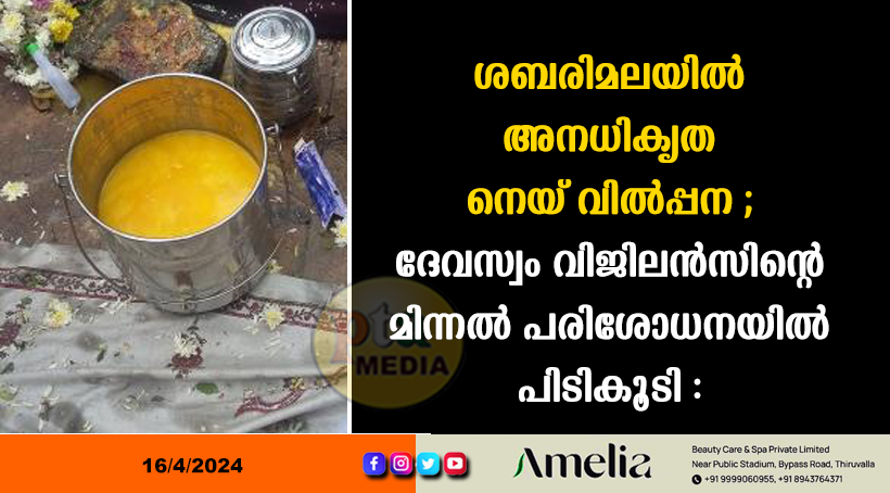 ശബരിമല – ദേവസ്വം വിജിലൻസും ടെമ്പിൾ സ്പെഷൽ ഓഫീസറും നടത്തിയ മിന്നൽ പരിശോധനയിൽ അനധികൃത നെയ്യ് വിൽപ്പന പിടികൂടി. നെയ്യ് വിൽപ്പന കൗണ്ടറിലും ദേവസ്വം ജീവനക്കാരന്റെ താമസ സ്ഥലത്തും നിന്നുമായി കണക്കിൽപ്പെടാത്ത 14,500 രൂപയും കണ്ടെത്തി.