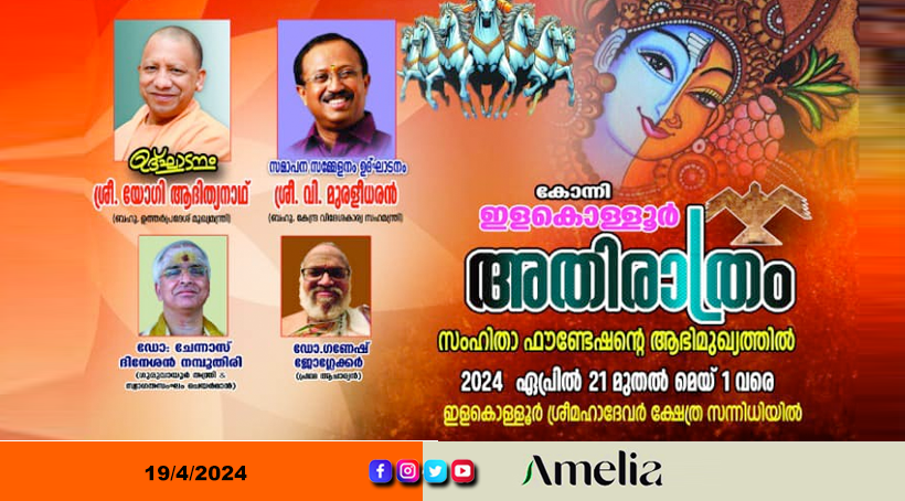 കോന്നി – ഇളകൊള്ളൂര്‍ അതിരാത്രം 21 ന് ആരംഭിക്കും. ശ്രീമഹാദേവര്‍ ക്ഷേത്രത്തില്‍ വച്ച് നടത്തപ്പെടുന്ന അതിരാത്രം മെയ് ഒന്നിനാണ് പൂര്‍ത്തിയാകുന്നത്. 2015 ല്‍ ഇതേ ക്ഷേത്രത്തില്‍ തന്നെയാണ് സോമയാഗം നടന്നത്. അതിരാത്രത്തിന്റെ ആദ്യത്തെ 6 ദിവസം സോമയാഗം തന്നെയാകും നടക്കുക. തുടര്‍ന്നാണ് രാത്രിയിലുള്‍പ്പടെ തടസ്സമില്ലാതെ അതിരാത്രം നടക്കുന്നത്.