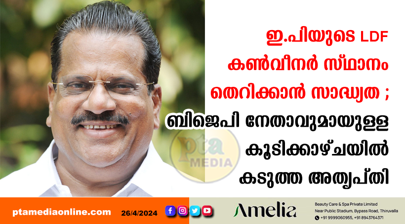 തിരുവനന്തപുരം – ബിജെപി നേതാവായ പ്രകാശ് ജാവഡേക്കറുമായി മകന്റെ വീട്ടിൽവെച്ചു നടന്ന കൂടിക്കാഴ്ചയിൽ ഇ.പി ജയരാജനെതിരെ കടുത്ത നടപടി ഉണ്ടായേക്കും. തുടർച്ചയായി പാർട്ടിയെ പ്രതിസന്ധിയിലാക്കുന്ന ഇപിയെ എൽഡിഎഫ് കൺവീനർ സ്ഥാനത്തുനിന്നും മാറ്റാനാണ് സാദ്ധ്യത. വോട്ട് ചെയ്തശേഷം ഇ.പി.ജയരാജന്റെ പേരെടുത്ത് മുഖ്യമന്ത്രി നടത്തിയ പരാമർശങ്ങൾ പാർട്ടി വൃത്തങ്ങളിൽതന്നെ അമ്പരപ്പുളവാക്കിയിരുന്നു. മുഖ്യമന്ത്രി തന്നെ വിവാദം തണുപ്പിച്ചെങ്കിലും കേന്ദ്രകമ്മിറ്റിയംഗംകൂടിയായ ഇ.പി.യുടെ കാര്യത്തിൽ സി.പി.എമ്മിൽ സംഘടനാ പരിശോധന അനിവാര്യമാവും.