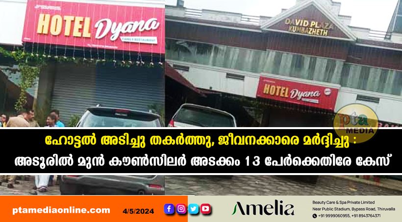 അടൂർ – ഹോട്ടൽ അടിച്ചു തകർക്കുകയും ജീവനക്കാരെ മർദ്ദിക്കുകയും ചെയ്ത കേസിൽ മുൻ മുനിസിപ്പൽ കൗൺസിലർ അടക്കം 13 പേർക്കെതിരേ പോലീസ് കേസെടുത്തു. ബൈപ്പാസിൽ പ്രവർത്തിക്കുന്ന ഹോട്ടൽ ഡയാനയ്ക്ക് നേരെ വ്യാഴാഴ്ച രാത്രി പതിനൊന്നരയോടെയാണ് അക്രമം നടന്നത്. ഹോട്ടൽ മാനേജറന്മാരായ വിപിൻ ജോസ്, അയിൻ ജോസ് എന്നിവരെ ക്രൂരമായി മർദ്ദിച്ചു. ഇവർ തിരുവനന്തപുരം മെഡിക്കൽ കോളജിൽ ചികിൽസയിലാണ്. ഹോട്ടലിന്റെ കൗണ്ടറിന്റെ ചില്ല് അടിച്ചു തകർത്തു.