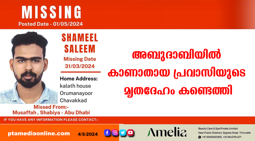 അബുദാബി – കഴിഞ്ഞ മാർച്ച് 31 മുതൽ കാണാതായിരുന്ന മലയാളി യുവാവിൻ്റെ മൃതദേഹം കണ്ടെത്തി. തൃശൂരിലെ ഒരുമനയൂർ കാളത്ത് സലിമിന്റെ മകൻ ഷെമിലി (28) ൻ്റെ മൃതദേഹമാണ് അബുദാബി പൊലീസ് നടത്തിയ അന്വേഷണത്തിൽ കണ്ടെത്തിയത്. മാർച്ച് 31 മുതലാണ് ഷെമിലിനെ കാണാതായത്. അക്കൗണ്ടന്റായി ജോലി ചെയ്യുകയായിരുന്നു. അബുദാബി മുസഫ ഇൻഡസ്ട്രിയൽ ഏരിയയിലാണ് ഷെമീൽ താമസിച്ചിരുന്നത്.