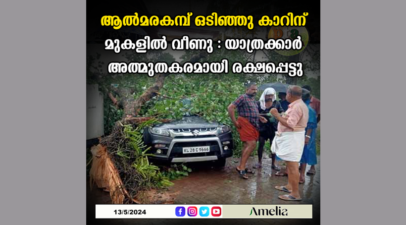 മല്ലപ്പള്ളി – ആല്മരത്തിന്റെ ഒരു വലിയ കമ്പ് കാറിന് മുകളില് ഒടിഞ്ഞുവീണു, യാത്രക്കാര് അത്ഭുതകരമായി രക്ഷപ്പെട്ടു. തിങ്കള് ഉച്ചയ്ക്ക് രണ്ടുമണിക്കാണ് അപകടമുണ്ടായത്. എഴുമറ്റൂര് കണ്ണച്ച ദേവക്ഷേത്രം പടിയറ റോഡില് നിന്നും ചാലാപ്പള്ളി ഭാഗത്തേക്ക് പോകാനെത്തിയ എഴുമറ്റൂര് സ്വദേശി പെരുമ്പ്രാടത്ത് വീട്ടില് സുനില്കുമാറും ഭാര്യ രേഖയും സഞ്ചരിച്ചിരുന്നു കാറിന് മുകളിലാണ് മരം ഒടിഞ്ഞ് വീണത്.കെഎസ്ഇബി അധികൃതരും പെരുമ്പെട്ടി പോലീസും സംഭവ സ്ഥലത്ത് എത്തി.പ്രദേശവാസികള് മുന്കൈയെടുത്ത് മരത്തിന്റെ ശിഖരങ്ങള് മുറിച്ചുമാറ്റിയാണ് കാര് പുറത്തെടുത്തത്.