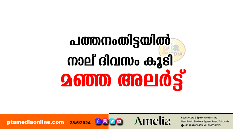പത്തനംതിട്ട ജില്ലയിൽ മേയ് 28 മുതൽ 31 വരെ മഞ്ഞ അലർട്ടായിരിക്കുമെന്ന് കേന്ദ്ര കാലാവസ്ഥ വകുപ്പ് അറിയിച്ചു. 28 ന് പത്തനംതിട്ട, ആലപ്പുഴ, എറണാകുളം ജില്ലകളിലും 29 നും 30 നും പത്തനംതിട്ട, ആലപ്പുഴ, കോട്ടയം, എറണാകുളം, തൃശൂർ ജില്ലകളിലും 31ന് പത്തനംതിട്ട, ആലപ്പുഴ, കോട്ടയം, എറണാകുളം, ഇടുക്കി, തൃശൂർ ജില്ലകളിലുമാണ് മഞ്ഞ അലർട്ട് പ്രഖ്യാപിച്ചിട്ടുള്ളത്. ഒറ്റപ്പെട്ട ശക്തമായ മഴയ്ക്ക് സാധ്യതയുണ്ട്. 24 മണിക്കൂറിൽ 64.5 മില്ലിമീറ്ററിൽ മുതൽ 115.5 മില്ലിമീറ്റർ വരെ മഴ ലഭിക്കാം.