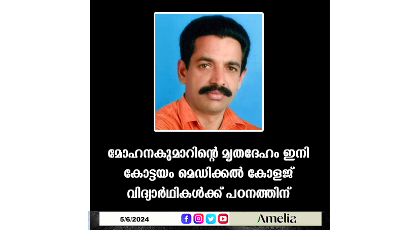 കോന്നി: അന്തരിച്ച വെള്ളപ്പാറ പാർവതി മന്ദിരം പി മോഹനകുമാർ(68)ന്റെ മൃതദേഹം ഇനി കോട്ടയം മെഡിക്കൽ കോളേജ് അനാട്ടമി വിഭാഗത്തിൽ വിദ്യാർത്ഥികൾക്ക് പഠനത്തിന്. ശ്വാസകോശ സംബന്ധമായ അസുഖത്തെ തുടർന്ന് കഴിഞ്ഞ കുറെ കാലങ്ങളായി ചികിത്സയിൽ കഴിയവേ ആയിരുന്നു മരണം സംഭവിച്ചത്.