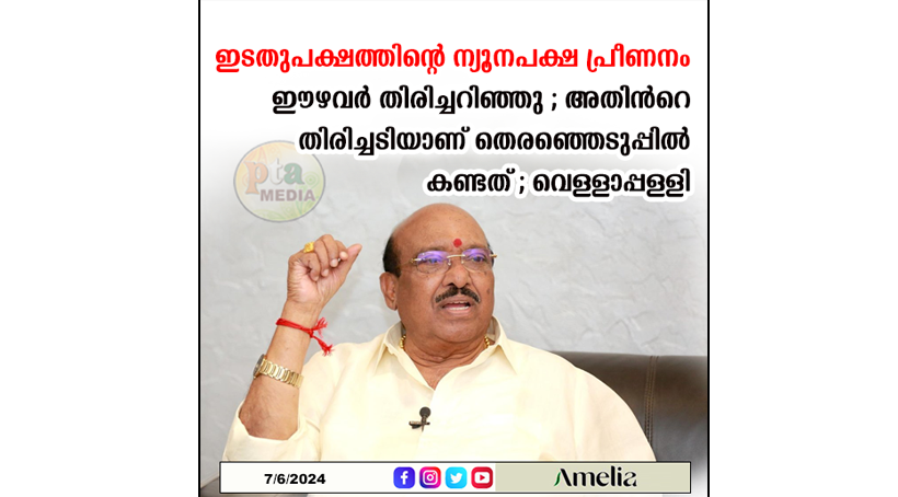എറണാകുളം : – തിരഞ്ഞെടുപ്പ് തോൽവി വിലയിരുത്തി സിപിഎമ്മിനെതിരെ ആഞ്ഞടിച്ചു വെള്ളാപ്പള്ളി നടേശൻ. ഈഴവരാദി പിന്നോക്ക വിഭാഗങ്ങൾക്ക് സർക്കാരിൽ നിന്നും ഇടതുപക്ഷത്തുനിന്നും നീതി കിട്ടുന്നില്ല. അതിൻറെ തിരിച്ചടിയാണ് തെരെഞ്ഞെടുപ്പിൽ കിട്ടിയത്. ഇന്നലെകളിൽ ഇടതുപക്ഷത്തെ സഹായിച്ച ഈഴവർ അടക്കമുള്ള പിന്നോക്ക സമുദായങ്ങൾ ഇപ്പോൾ മാറി ചിന്തിച്ചു. ന്യൂനപക്ഷങ്ങളെ, പ്രത്യേകിച്ച് മുസ്ലീംങ്ങളെ എങ്ങനെയൊക്കെ പ്രീണിപ്പിക്കാമെന്നാണ് ഇടതുപക്ഷ ചിന്തയെന്നും അതിൻറെ തിരിച്ചടിയാണ് തെരഞ്ഞെടുപ്പിൽ കണ്ടതെന്നും വെള്ളാപ്പള്ളി.