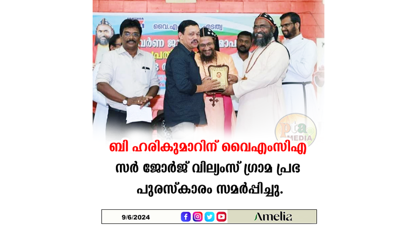 മലയാള മനോരമ എടത്വ ബ്യൂറോ റിപ്പോർട്ടർ ബി ഹരികുമാറിന് വൈഎംസിഎ സർ ജോർജ് വില്യംസ് ഗ്രാമ പ്രഭ പുരസ്കാരം ക്നാനായ കത്തോലിക്ക സഭ കോട്ടയം അതിരുപത സഹായമെത്രാൻ ഗീവർഗീസ് മാർ അപ്രേം സമ്മാനിക്കുന്നു.