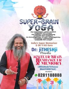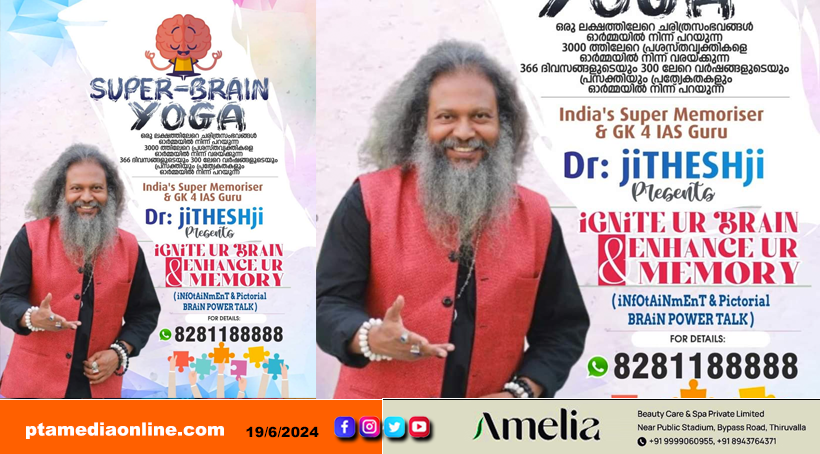 സൂപ്പർ മെമ്മറൈസറും ബ്രെയിൻ പവർ ഗുരുവുമായ ഡോ: ജിതേഷ്ജി ഉദ്ഘാടനം ചെയ്യും. പതജ്ഞലി യോഗയിൽ നിന്നും ഹഠയോഗയിൽ നിന്നും വ്യത്യസ്തമായി മനുഷ്യമസ്തിഷ്കത്തെയും ഓർമ്മശക്തിയെയും ഉദ്ദീപിപ്പിക്കുന്ന പ്രയോഗരീതികളാണ് ഡോ : ജിതേഷ്ജി ആവിഷ്കരിച്ചു പ്രചരിപ്പിക്കുന്ന ‘ബൗദ്ധിക് യോഗ ‘ എന്ന സൂപ്പർ ബ്രയിൻ പവർ യോഗയിൽ അവലംബിച്ചിരിക്കുന്നത് . മനുഷ്യ മേധാശക്തിയെ പ്രോജ്വലിപ്പിച്ച് ജോലിയും ജീവിതവും എങ്ങനെ മെച്ചപ്പെടുത്തുന്നുവെന്നും അൽഷിമേർഴ്സ്, ഡിമെൻഷ്യ പോലെയുള്ള മനുഷ്യ മേധാശക്തിയെ പ്രതികൂലമായി ബാധിക്കുന്ന പ്രശ്നങ്ങൾക്ക് പരിഹാരവുമാണ് ‘ബൗദ്ധിക് യോഗ’ മുന്നോട്ടുവെയ്ക്കുന്നത്.