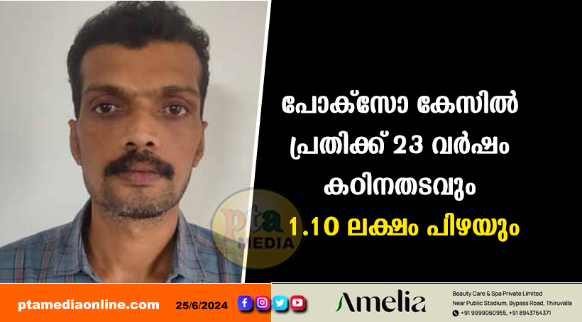 അടൂർ: പ്രായപൂർത്തിയാകാത്ത പെൺകുട്ടിയെ പീഡിപ്പിച്ച കേസിൽ പ്രതിക്ക് 23 വർഷം കഠിനതടവും 1.10 ലക്ഷം പിഴയും വിധിച്ച് പോക്സോ കോടതി. കൊട്ടാരക്കര കടയ്ക്കൽ അയിരക്കുഴി പാലക്കൽ പ്ലാവിള പുത്തൻ വീട്ടിൽ പ്രശാന്തിനെ(36)യാണ് അതിവേഗ സ്പെഷ്യൽ ജഡ്ജ് ടി. മഞ്ജിത്ത് കുറ്റക്കാരൻ ആണെന്ന് കണ്ടെത്തി ശിക്ഷിച്ചത്. പിഴ അടച്ചില്ലെങ്കിൽ ഏഴുമാസം കൂടി അധിക കഠിന തടവും അനുഭവിക്കണം പ്രായപൂർത്തിയാകാത്ത പെൺകുട്ടിയെ വിവാഹ വാഗ്ദാനം ചെയ്ത് വീട്ടിൽ നിന്നും കടത്തിക്കൊണ്ടു പോയി ലൈംഗികാതിക്രമം നടത്തിയെന്നാണ് കേസ്. 2016 ലാണ് സംഭവം. ഒളിവിൽ പോയ പ്രതിയെ കഴിഞ്ഞ വർഷം എറണാകുളത്തു നിന്നും പോലീസ് കണ്ടെത്തി അറസ്റ്റ് ചെയ്യുകയായിരുന്നു. ഇന്ത്യൻ ശിക്ഷ നിയമപ്രകാരവും പോക്സോ ആക്ട് പ്രകാരവും പ്രതി കുറ്റക്കാരൻ ആണെന്ന് കണ്ടെത്തി. പ്രോസിക്യൂഷന് വേണ്ടി സ്പെഷ്യൽ പബ്ലിക് പ്രോസിക്യൂട്ടർ അഡ്വ. സ്മിത ജോൺ ഹാജരായി.