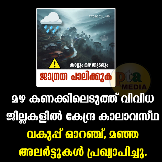 മഴ കണക്കിലെടുത്ത് വിവിധ ജില്ലകളിൽ കേന്ദ്ര കാലാവസ്ഥ വകുപ്പ് ഓറഞ്ച്, മഞ്ഞ അലർട്ടുകൾ പ്രഖ്യാപിച്ചു.
