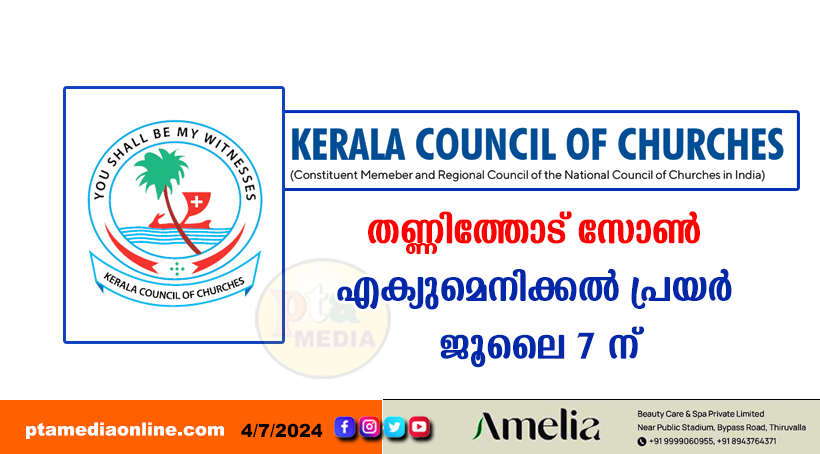 തണ്ണിത്തോട്: കേരള കൗൺസിൽ ഓഫ് ചർച്ചസ് തണ്ണിത്തോട് സോണിൻ്റെ പരിധിയിൽ ഉള്ള ഇടവകകളുടെ അഭിമുഖ്യത്തിൽ നടത്തുന്ന എക്യുമെനിക്കൽ പ്രയർ ജൂലൈ 7 ഞായറാഴ്ച വൈകിട്ട് 5 മണിക്ക് തണ്ണിത്തോട് സെൻ്റ് ആൻറണീസ് അശ്രമത്തിൽ വെച്ച് നടത്തപ്പെടുന്നു. സോൺ പ്രസിഡൻ്റ് റവ ഡെയിൻസ് പി സമുവേൽ ഉദ്ഘാടനം നിർവഹിക്കുന്നു. വചനപ്രഘോഷണം ശ്രീമതി മിൻ്റ മറിയം വർഗ്ഗീസ് (റിസേർച്ച് സ്കോളർ കതോലിക്കേറ്റ് കോളജ്) നടത്തുന്നതുമാണ്. വിവിധ ഇടവകളിലെ വികാരിമാർ, കെ സി സി എക്സിക്യൂട്ടിവ് ഭാരവാഹികൾ, വിവിധ സോണുകളിലെ വൈദികർ, പ്രതിധികൾ പങ്കെടുക്കമെന്ന് സോൺ സെക്രട്ടറി അനീഷ് തോമസ് അറിയിച്ചു.